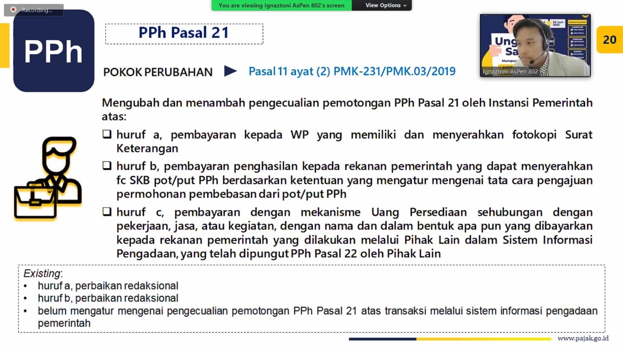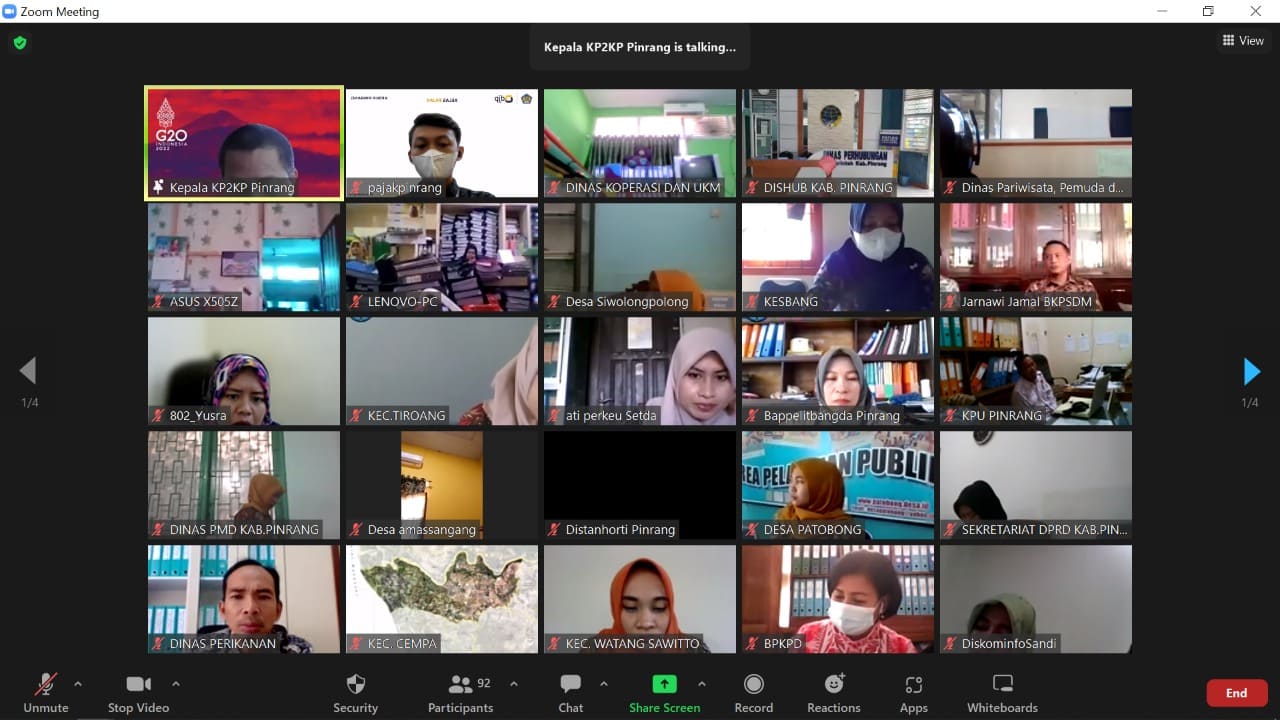 Kantor Pelayanan, Penyuluhan, dan Konsultasi Perpajakan (KP2KP) Pinrang bersama Kantor Pelayanan Pajak (KPP) Pratama Parepare menyelenggarakan acara sosialisasi PMK Nomor 59 Tahun 2022 secara daring melalui aplikasi zoom meeting, Kabupaten Pinrang (Kamis, 2/6). Sosialisasi tersebut diikuti oleh perwakilan Satuan Kerja Perangkat Daerah (SKPD) dan instansi vertikal yang berada di lingkungan Pemerintah Daerah Kabupaten Pinrang.
