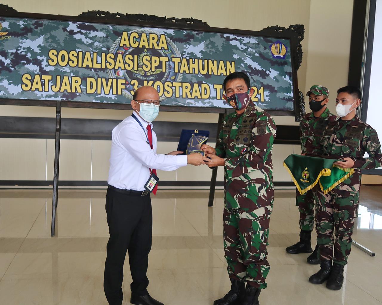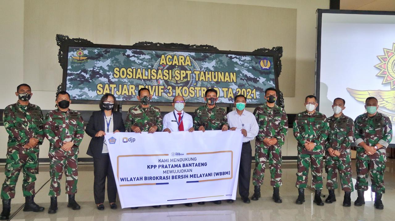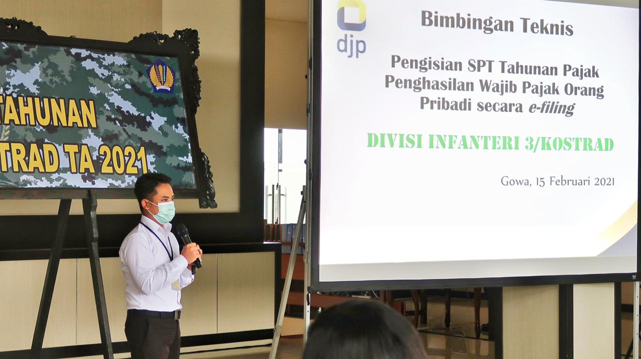 Kantor Pelayanan Pajak (KPP) Pratama Bantaeng bekerja sama dengan Divisi Infanteri 3 Kostrad menyelenggarakan Sosialisasi Perpajakan dan Asistensi Pelaporan Surat Pemberitahuan (SPT) Tahunan bagi Anggota TNI (Senin, 15/2). Acara ini dilangsungkan di ruang aula Divisi Infanteri 3 Kostrad Bontomarannu Kabupaten Gowa dengan tetap menerapkan protokol kesehatan untuk penanggulangan penyebaran Covid-19.