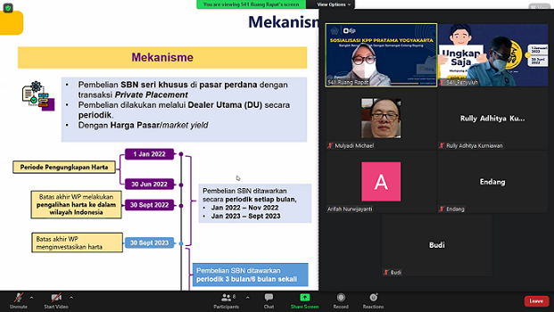 Sosialisasi tersebut dilaksanakan sejak pukul 09.00 WIB sampai dengan pukul 10.30 WIB dengan diikuti oleh 8 peserta. Sosialisasi ini bertujuan untuk menggencarkan Program Pengungkapan Sukarela yang berakhir pada tanggal 30 Juni 2022.