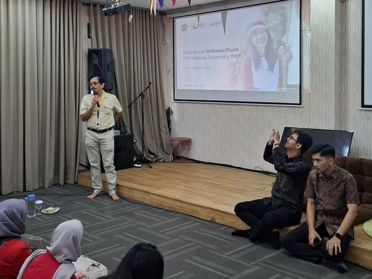 Kantor Pelayanan Pajak (KPP) Pratama Tangerang Barat menyelenggarakan pembekalan Relawan Pajak untuk Negeri (Renjani 2026). Kegiatan ini dilaksanakan di Aula Soetta KPP Pratama Tangerang Barat, Jalan Imam Bonjol Nomor 47, Sukajadi, Karawaci, Kota Tangerang, Banten (Kamis, 15/1). Kegiatan ini diikuti oleh mahasiswa yang terpilih sebagai Renjani 2026.