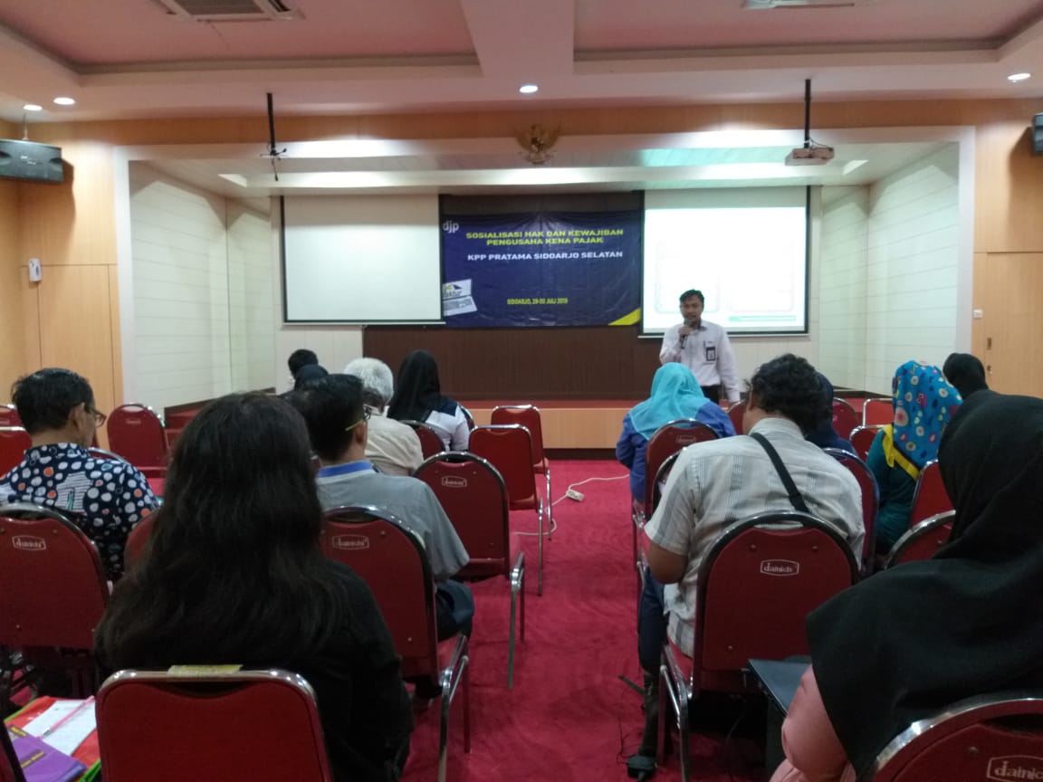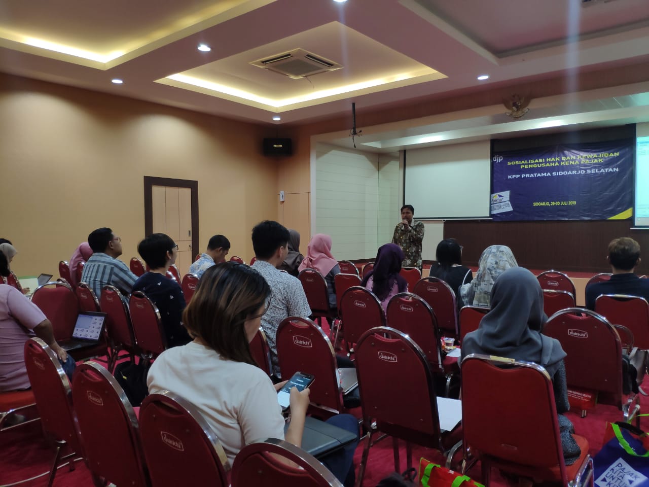 KPP Pratama Sidoarjo Selatan mengadakan penyuluhan kepada wajib pajak yang menjadi Pengusaha Kena Pajak (PKP) selama dua hari mulai Senin (29/7) sebagai sarana edukasi terkait kewajiban dan hak perpajakan PKP di Aula KPP Pratama Sidoarjo Selatan (Selasa, 30/7).