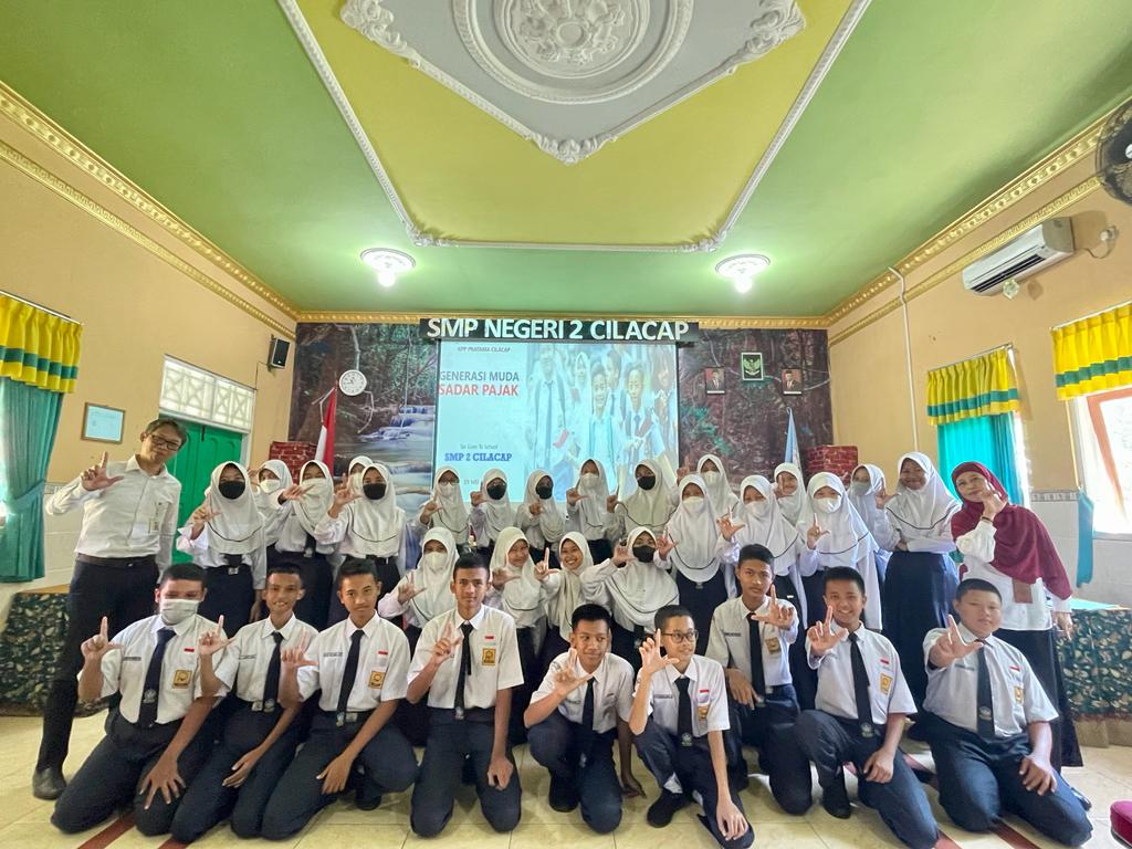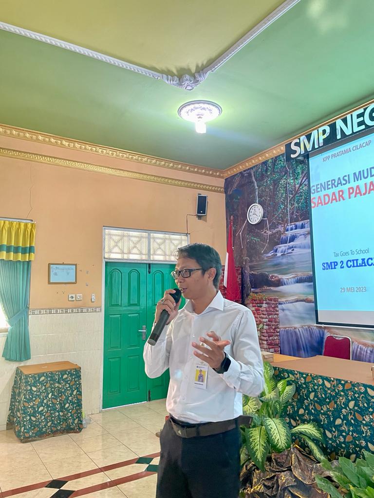 Kantor Pelayanan Pajak (KPP) Pratama Cilacap menggelar Tax Goes To School (TGTS) 2023 di SMPN 2 Cilacap (Senin, 29/5). Kegiatan ini dipandu oleh Tim Penyuluh Pajak KPP Pratama Cilacap Eliza Zumariana dan Andono Mitro Adi