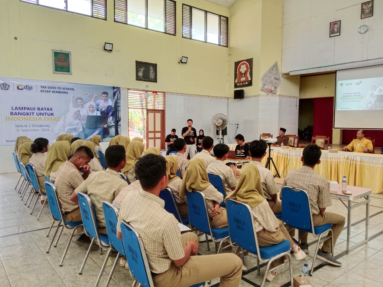 Kantor Pelayanan, Penyuluhan, dan Konsultasi Perpajakan (KP2KP) Rembang melakukan Sosialisasi Perpajakan kepada Siswa Sekolah Menengah Atas Negeri (SMAN) 3 Rembang (Kamis, 12/9). Kegiatan Tax Pajak Goes To School (TGTS) 2024 dilaksanakan dengan mengambil tema “Generasi Sadar Pajak, Muda Berkreasi Membangun Negeri dan tagline Tax Pajak Goes To School 2024 “Lampaui Batas Bangkit Untuk Indonesia Emas".