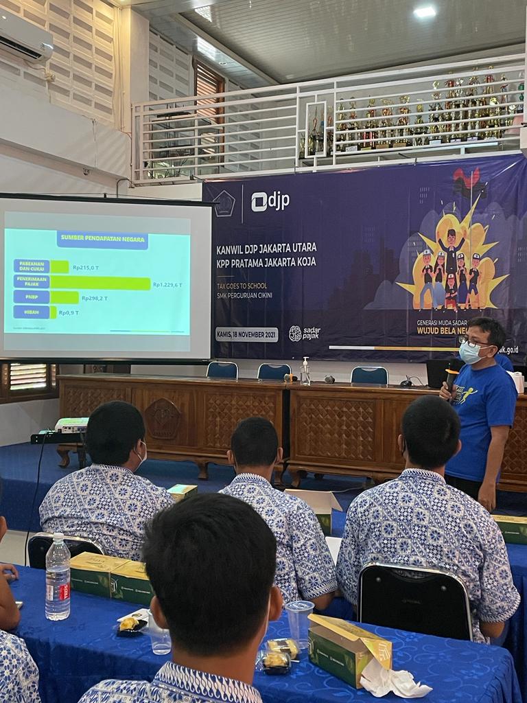 Penyuluh Pajak Kantor Pelayanan Pajak (KPP) Pratama Jakarta Koja bersama Kantor Wilayah (Kanwil) Direktorat Jenderal Pajak (DJP) Jakarta Utara mengunjungi SMK Perguruan Cikini Jakarta Jl. Alur Laut, Rawabadak Utara, Koja (Kamis, 18/11).