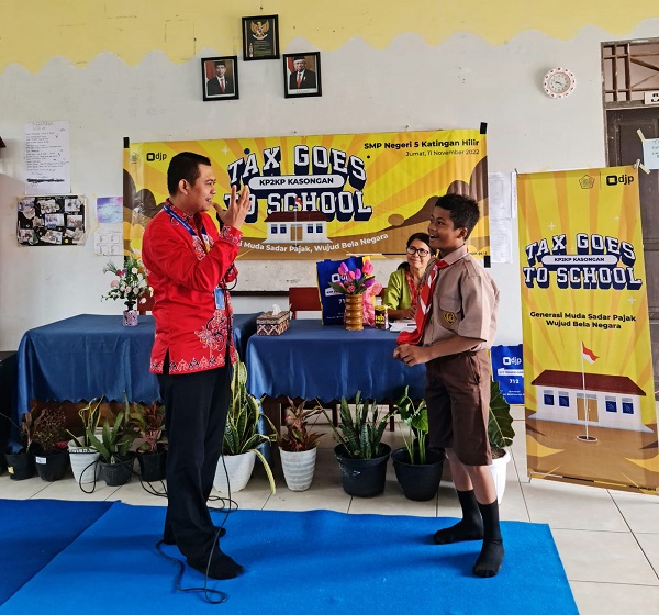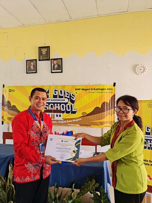 KP2KP Kasongan melaksanakan kegiatan Tax Goes to School (TGTS) 2022 di SMP Negeri 5 Katingan Hilir (Jumat, 11/11). Kepala Sekolah SMPN 5 Katingan Hilir, beberapa perwakilan guru, dan 90 orang siswa-siswi dengan antusias menyambut kedatangan Tim TGTS KP2KP Kasongan.