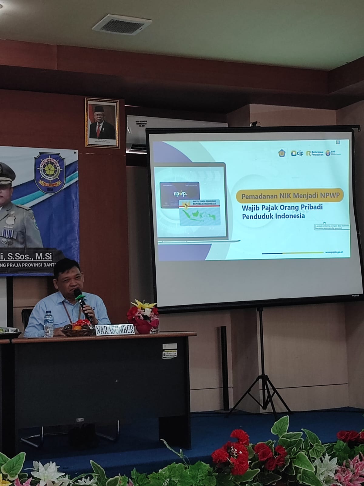 Kantor Wilayah Direktorat Jenderal Pajak (DJP) Banten melakukan sosialisasi terkait pemadanan Nomor Induk Kependudukan (NIK) menjadi Nomor Pokok Wajib Pajak (NPWP) sekaligus mengimbau Pelaporan Surat Pemberitahuan (SPT) Tahunan 2022 Orang Pribadi ke instansi Satuan Polisi Pamong Praja (Satpol PP) Provinsi Banten di Ruang Rapat Badan Kesbangpol Provinsi Banten, Kota Serang (Rabu, 1/2).