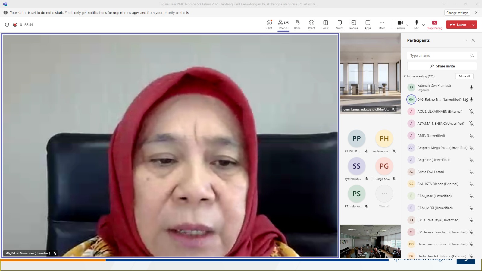 Teams Meeting dihadiri 140 peserta dengan pemateri Fungsional Penyuluh Pajak Fanita Pratiwi dan Yofie Fardian Mashudha. Ikut menghadiri Kepala KPP Madya Jakarta Utara Rekno Nawansari, menyampaikan materi terkait program pengendalian gratifikasi dan penanganan pengaduan serta perlindungan pelapor.