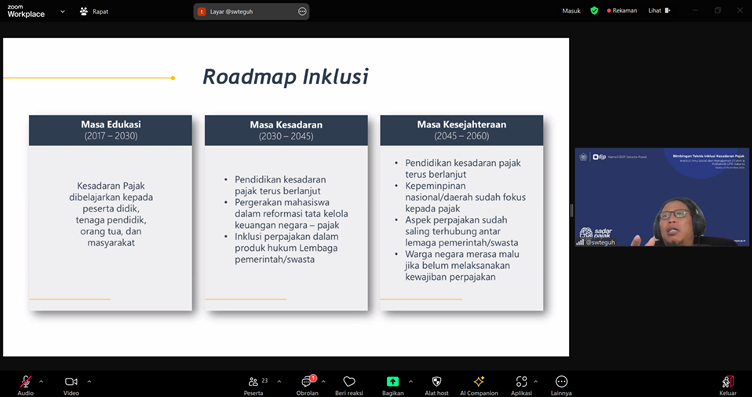Kegiatan kemudian dilanjutkan dengan pemaparan materi oleh Penyuluh Pajak Ahli Madya Kantor Wilayah DJP Jakarta Pusat Teguh Sri Wijaya. Teguh menyampaikan materi terkait tahapan-tahapan program Inklusi Kesadaran Pajak, pengenalan pajak secara singkat, serta materi terkait kebijakan penyusunan Rencana Pembelajaran Semester (RPS).