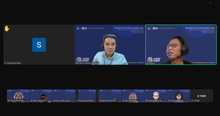Kantor Wilayah Direktorat Jenderal Pajak (Kanwil DJP) Jakarta Pusat melaksanakan kegiatan Bimbingan Teknis Inklusi Kesadaran Pajak di lingkungan Institut Ilmu Sosial dan Manajemen STIAMI dan Politeknik LP3I Jakarta, Jakarta (Selasa, 12/11).
