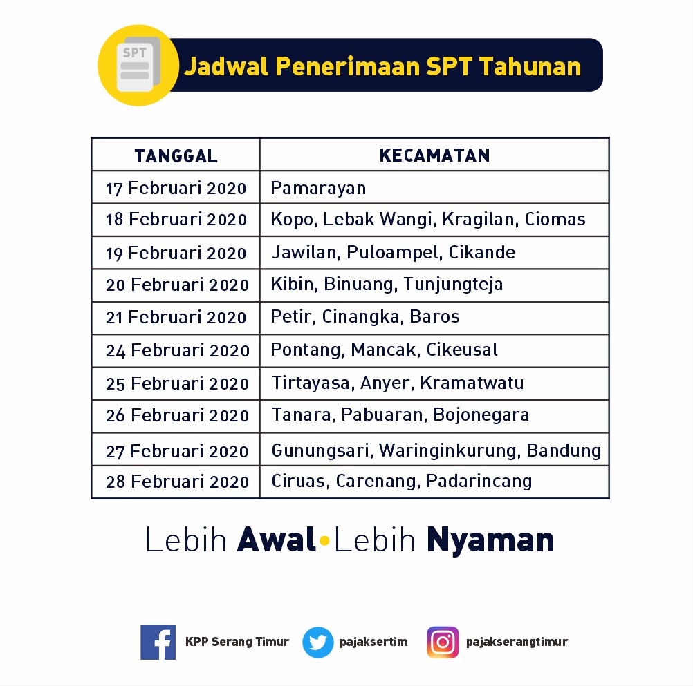 Layanan penerimaan SPT Tahunan PPh di 29 kecamatan di Kabupaten Serang ini dibuka selama sepekan lebih hingga 28 Februari 2020. KPP Pratama Serang Timur mempunyai wilayah kerja yang sangat luas yaitu Kabupaten Serang yang mencakup 29 kecamatan, sedangkan kantor layanan ada di Kota Serang. Jarak tentu menjadi kendala untuk dapat meningkatkan kepatuhan wajib pajak.