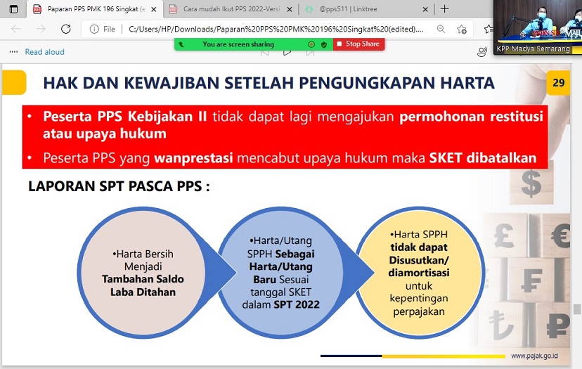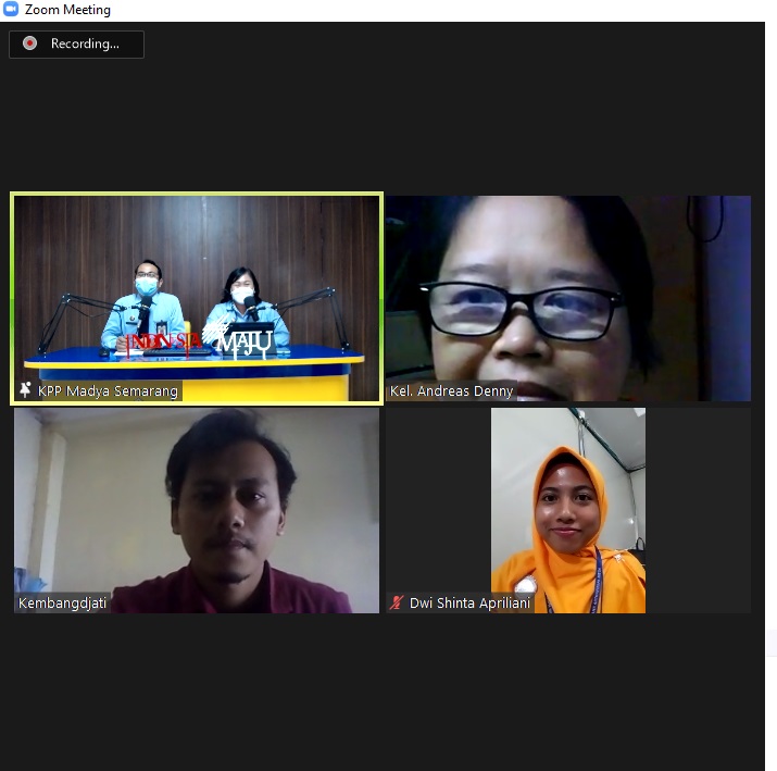 Tim Penyuluh Kantor Pelayanan Pajak (KPP) Madya Semarang kembali mengadakan kelas pajak Program Pengungkapan Sukarela (PPS) secara daring melalui aplikasi Zoom Cloud Meetings di studio KPP Madya Semarang, Kota Semarang (Rabu, 9/2). Kegiatan ini diselenggarakan secara rutin setiap hari Rabu selama bulan Januari sampai dengan Maret tahun 2022.
