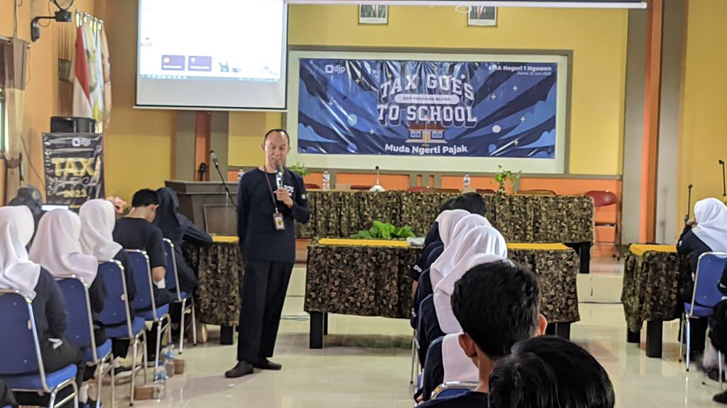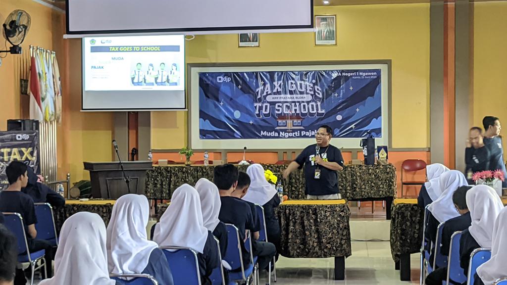 Kantor Pelayanan Pajak (KPP) Pratama Blora bersama Kantor Pelayanan, Penyuluhan, dan Konsultasi Perpajakan (KP2KP) Purwodadi menyelenggarakan kegiatan Tax Goes to School (TGTS) di Sekolah Menengah Atas Negeri (SMAN) 1 Ngawen, Kabupaten Blora (Kamis, 22/6).