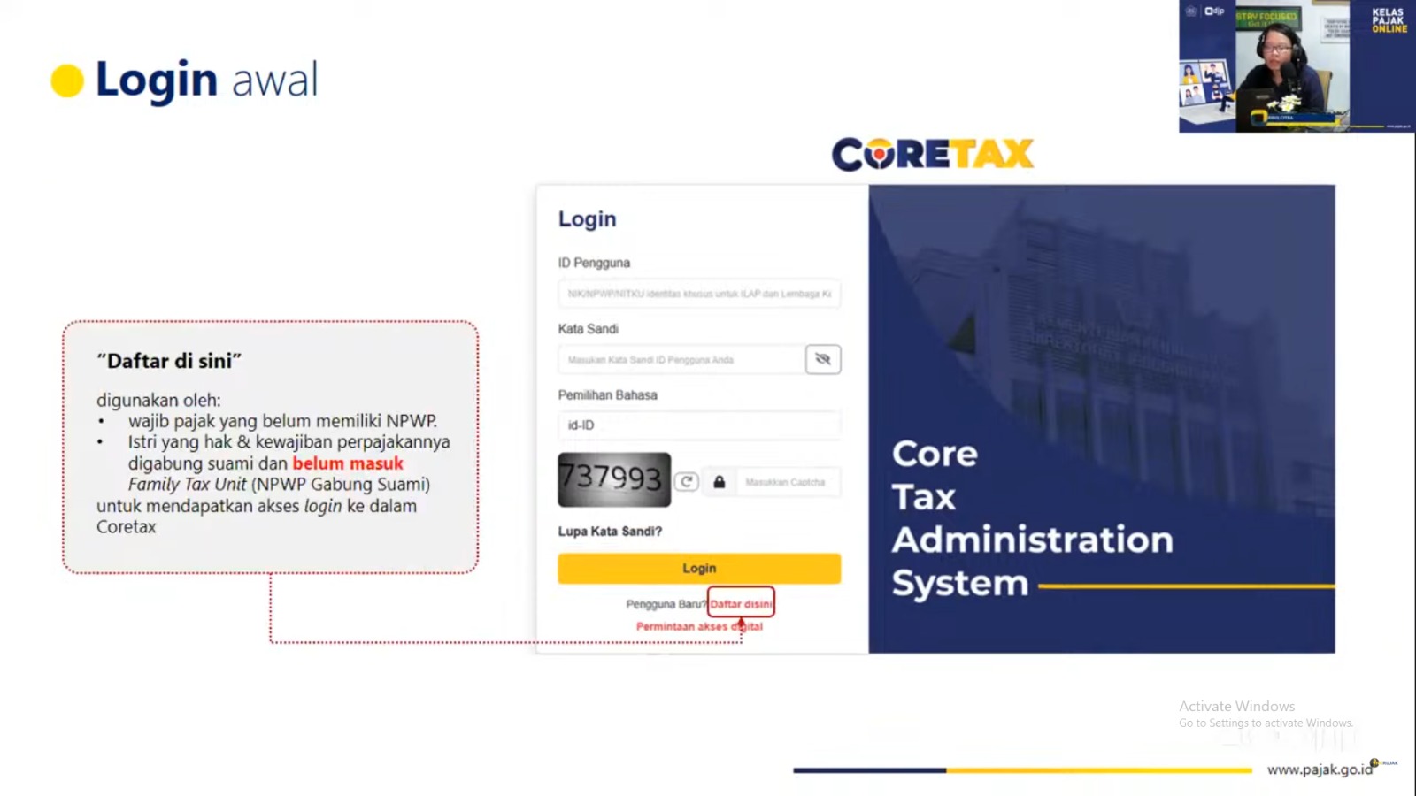 Riris menambahkan untuk memastikan bahwa akun layanan perpajakan saat ini di DJP Online sudah aktif dan data-data yang terdapat di dalamnya sudah lengkap, update, dan valid agar peserta dapat masuk ke dalam aplikasi Coretax.
