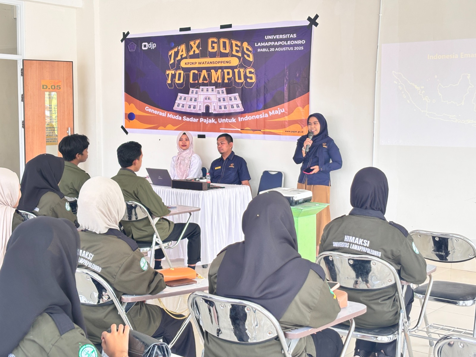 Kantor Pelayanan Penyuluhan dan Konsultasi Perpajakan (KP2KP) Watansoppeng menggelar acara tax goes to campus di Universitas Lamappapoleonro, Kabupaten Soppeng (Rabu, 20/8). Kegiatan yang mengusung tema “Generasi Muda Sadar Pajak untuk Indonesia Maju” ini diikuti oleh 25 mahasiswa program studi Akuntansi.