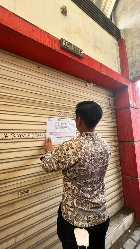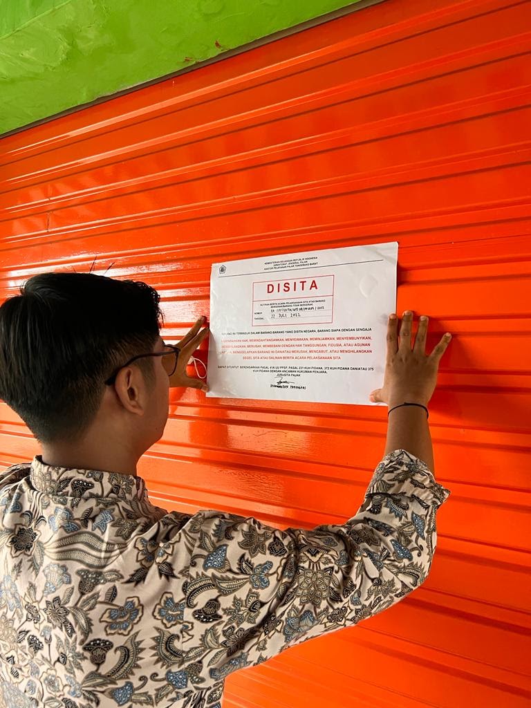 Juru Sita Kantor Pelayanan Pajak (KPP) Pratama Tangerang Barat Indra melakukan prosedur penagihan utang pajak melalui tahapan penyitaan aset wajib pajak dengan menempelkan segel sita di beberapa kios yang bertempat di Mardigrass Citra Raya Kota Tangerang (Jumat, 22/7).