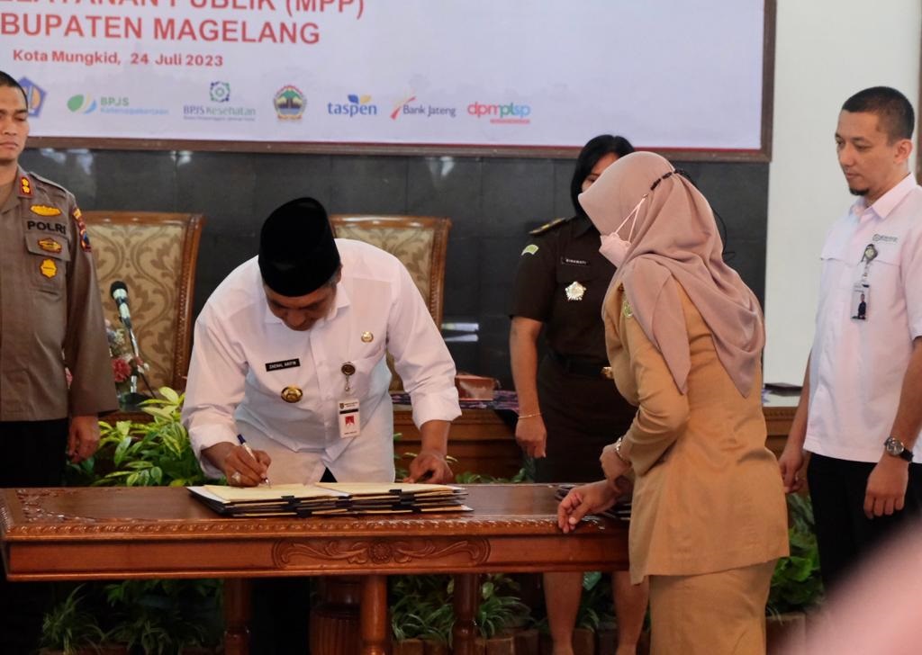Dalam sambutannya pada seremoni penandatanganan kerja sama, Bupati Magelang Zaenal Arifin menyampaikan bahwa MPP merupakan suatu bentuk sinergi antar instansi pemerintah dalam memberikan pelayanan kepada masyarakat. “MPP diharapkan dapat memfasilitasi masyarakat dalam menjangkau layanan dari instansi vertikal, OPD, BUMN serta BUMD yang terintegrasi,” ungkapnya.