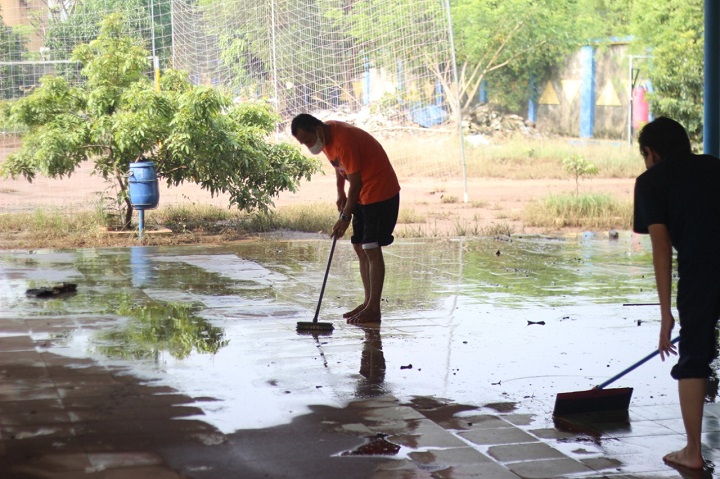 Para pegawai bahu-membahu untuk membersihkan sisa-sisa lumpur yang diakibatkan banjir setinggi dada di halaman KPP Pratama Cibitung dengan menggunakan berbagai peralatan seperti gerobak, sekop, serokan, serta karung goni. Selain halaman kantor, ruangan dalam gedung kantor juga turut dibersihkan dari lumpur dan material yang masih tersisa.