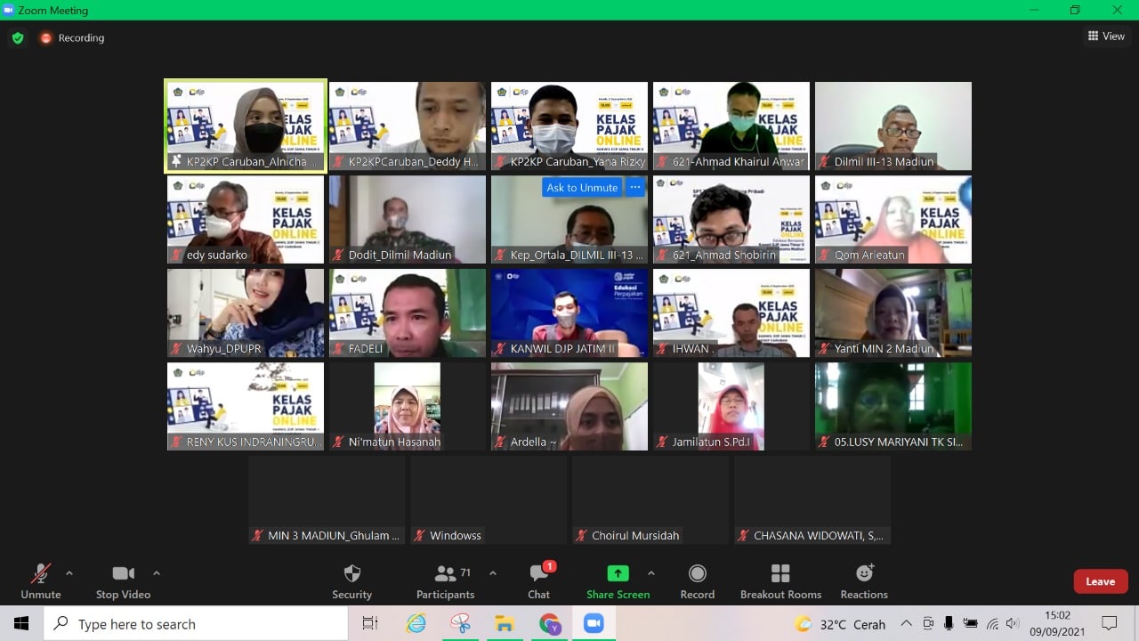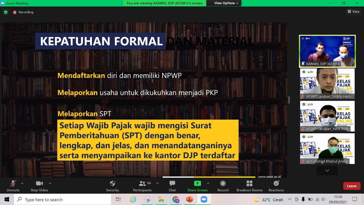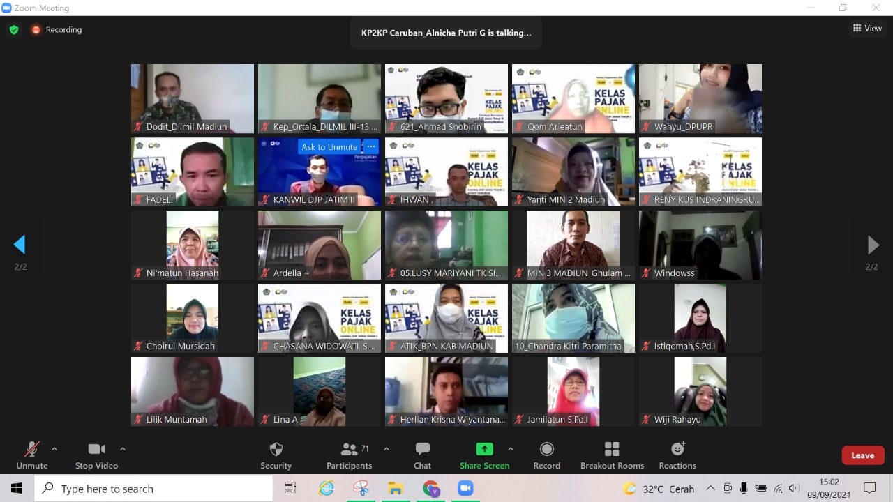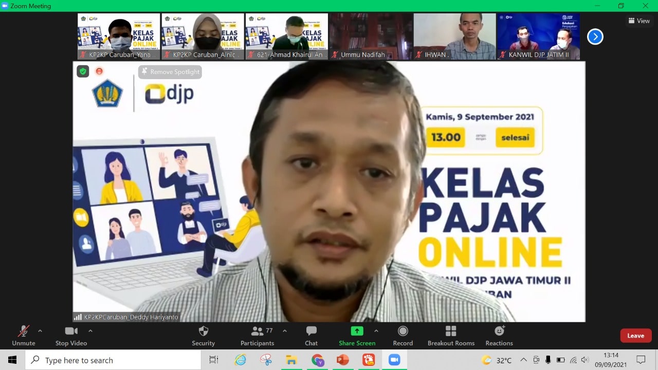 Kantor Pelayanan, Penyuluhan, dan Konsultasi Perpajakan (KP2KP) Caruban bersama Kantor Wilayah Direktorat Jenderal Pajak (Kanwil DJP) Jawa Timur II mengadakan Kelas Pajak Pelaporan Surat Pemberitahuan (SPT) Tahunan bagi wajib pajak Aparatur Sipil Negara (ASN) melalui aplikasi Zoom Meeting di Kabupaten Madiun. Tercatat hampir 100 ASN mengikuti kelas pajak daring tersebut (Kamis, 9/9).