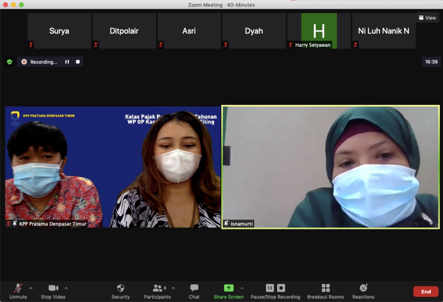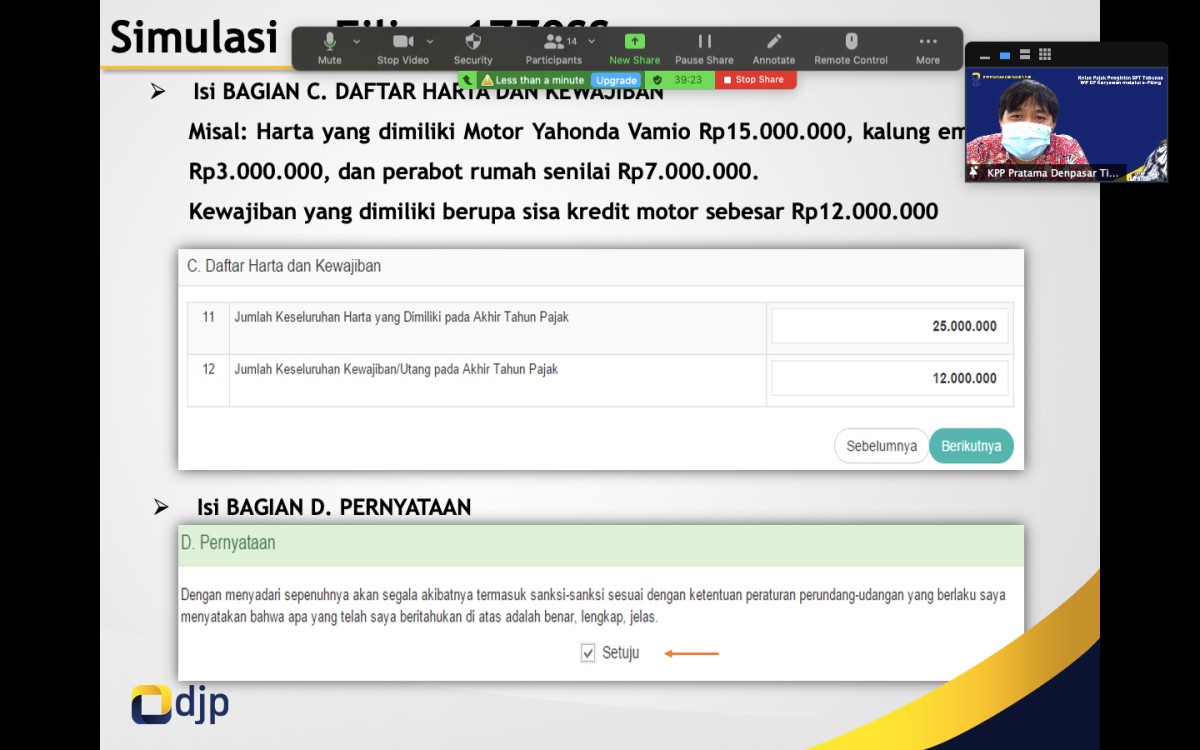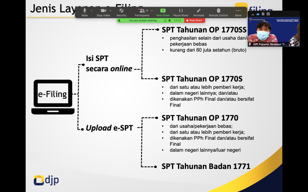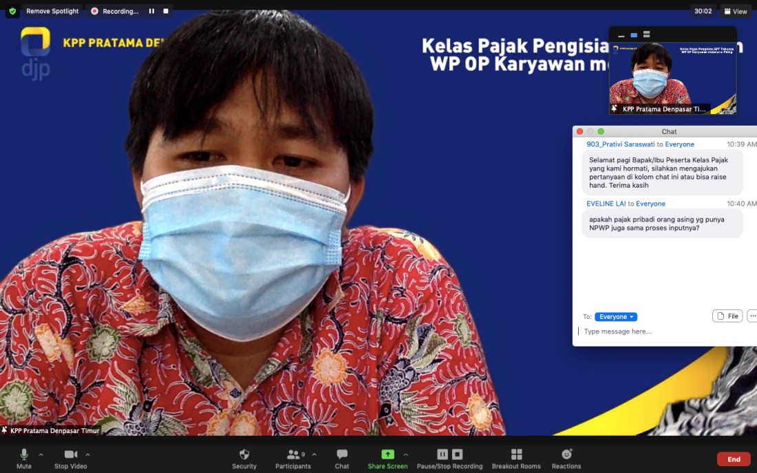 Tim Penyuluh Perpajakan KPP Pratama Denpasar Timur menggelar Kelas Pajak Pengisian SPT Tahunan Wajib Pajak Orang Pribadi Karyawan melalui e-Filing secara daring melalui Zoom Meeting di Denpasar (Selasa, 9/2). Kegiatan ini diikuti oleh 10 peserta yang merupakan wajib pajak yang terdaftar di KPP Pratama Denpasar Timur. Dimulai pada pukul 10.00 WITA, kegiatan sosialisasi berlangsung lancar dan cukup interaktif.