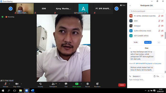 Kantor Pelayanan Pajak (KPP) Pratama Jombang bekerja sama dengan Kantor Wilayah DJP Jawa Timur II (Kanwil DJP Jatim II) melaksanakan diskusi perpajakan secara daring melalui Zoom Meeting di Jombang (Rabu, 30/6). Kegiatan ini dihadiri oleh wajib pajak strategis yang terdaftar di KPP Pratama Jombang.