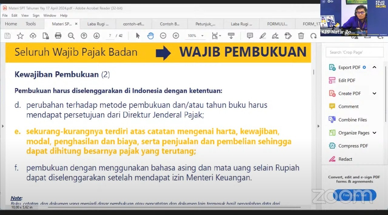 Kantor Pelayanan Pajak (KPP) Pratama Natar menggelar Kelas Pajak untuk Wajib Pajak Badan dengan tema Surat Pemberitahuan (SPT) Tahunan Badan 1771 secara daring melalui aplikasi Zoom Cloud Meeting (Selasa, 10/9).