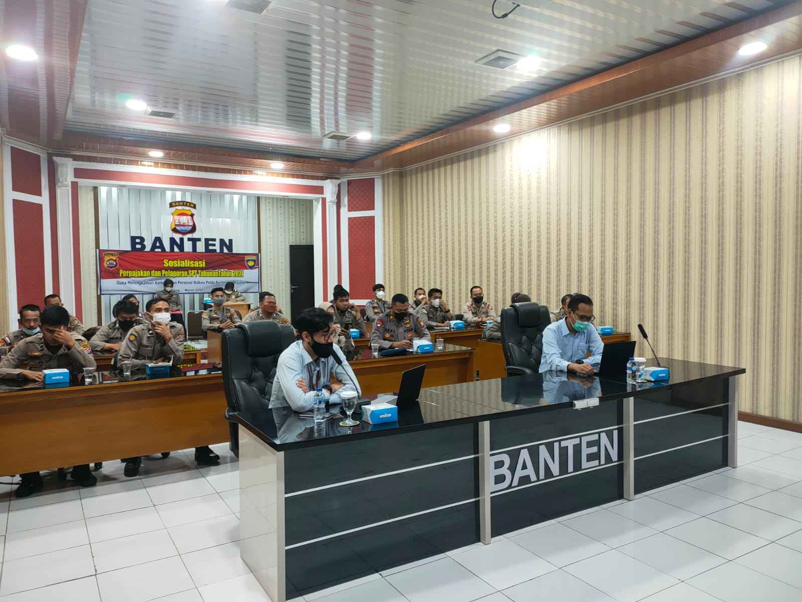 Peserta sosialisasi adalah bendahara dari masing-masing satker di lingkungan Polda Banten. Fungsional Penyuluh Pajak KPP Pratama Serang arat Muhammad Ridhwan dan Account Representative M. Tauchid menyampaikan informasi seputar pelaporan SPT Tahunan dan kewajiban bendahara Instansi Pemerintah terbaru.