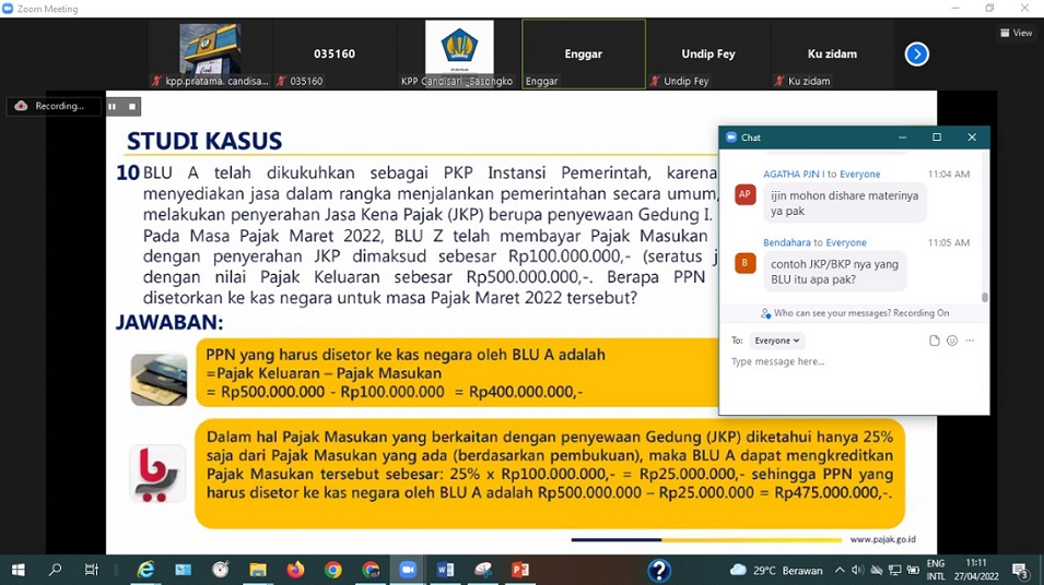 Kantor Pelayanan Pajak (KPP) Pratama Semarang Candisari menggelar sosialisasi Peraturan Direktur Jenderal Pajak Nomor PER-03 Tahun 2022 tentang Faktur Pajak dan Peraturan Pemerintah (PP) No. 9 Tahun 2022 tentang Jasa Konstruksi bagi Wajib Pajak Badan Pengusaha Kena Pajak (PKP) melalui Aplikasi Zoom Meeting di Semarang (Selasa, 26/04).