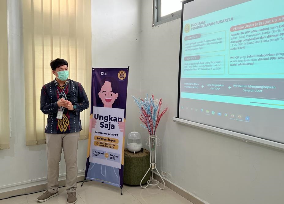 Kantor Pelayanan, Penyuluhan, dan Konsultasi Pepajakan (KP2KP) Tanjung Batu dan Kantor Pelayanan Pajak (KPP) Pratama Tanjung Balai Karimun bekerja sama menyukseskan Program Pengungkapan Sukarela (PPS) dengan menyelenggarakan edukasi kepada para wajib pajak di Aula KP2KP Tanjung Batu, Karimun, Kepulauan Riau (Selasa, 19/4).