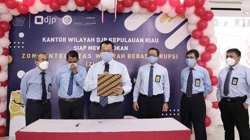 Kepala Kantor Wilayah Direktorat Jenderal Pajak Kepulauan Riau (Kanwil DJP Kepri) Cucu Supriatna menandatangi Lembar Konfirmasi Kesediaan Mengikuti Penilaian Zona Integritas menuju Wilayah Bebas dari Korupsi (ZI-WBK) Tahun 2022 yang disaksikan oleh seluruh pegawai secara langsung maupun secara daring di Aula Barelang Kanwil DJP Kepri, Batam, Kepulauan Riau (Rabu, 18/8). Penandatangan dokumen ini dilaksanakan bersamaan dengan kegiatan memperingati Hari Ulang Tahun ke-76 Kemerdekaan Republik Indonesia.