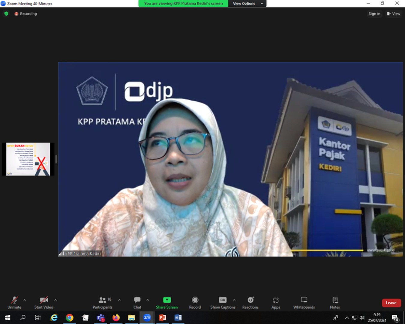 Kantor Pelayanan Pajak (KPP) Pratama Kediri memberikan edukasi perpajakan kepada Wajib Pajak Orang Pribadi secara daring melalui Kelas Pajak Online (Kamis, 25/7). Kegiatan ini ditujukan bagi Wajib Pajak Orang Pribadi yang baru mendaftarkan Nomor Pokok Wajib Pajak (NPWP) pada bulan April dan Mei 2024. Lasemi, Penyuluh Pajak KPP Pratama Kediri, menjelaskan, “Edukasi ini bertujuan meningkatkan pengetahuan perpajakan bagi Wajib Pajak Orang Pribadi yang baru terdaftar di bulan April dan Mei lalu.”