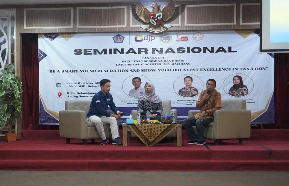 Universitas 17 Agustus 1945 (Untag) Semarang menyelenggarakan kegiatan seminar nasional perpajakan dengan tema “Be a Smart Young Generation and Show Your Greatest Excellence in Taxation” di Grha Kebangsaan Untag Semarang (Kamis, 17/10). Kegiatan dilaksanakan secara tatap muka dan dihadiri oleh segenap civitas academica yang tergabung dalam Tax Center Untag dengan mengundang narasumber dari Kantor Pelayanan Pajak (KPP) Pratama Semarang Tengah.