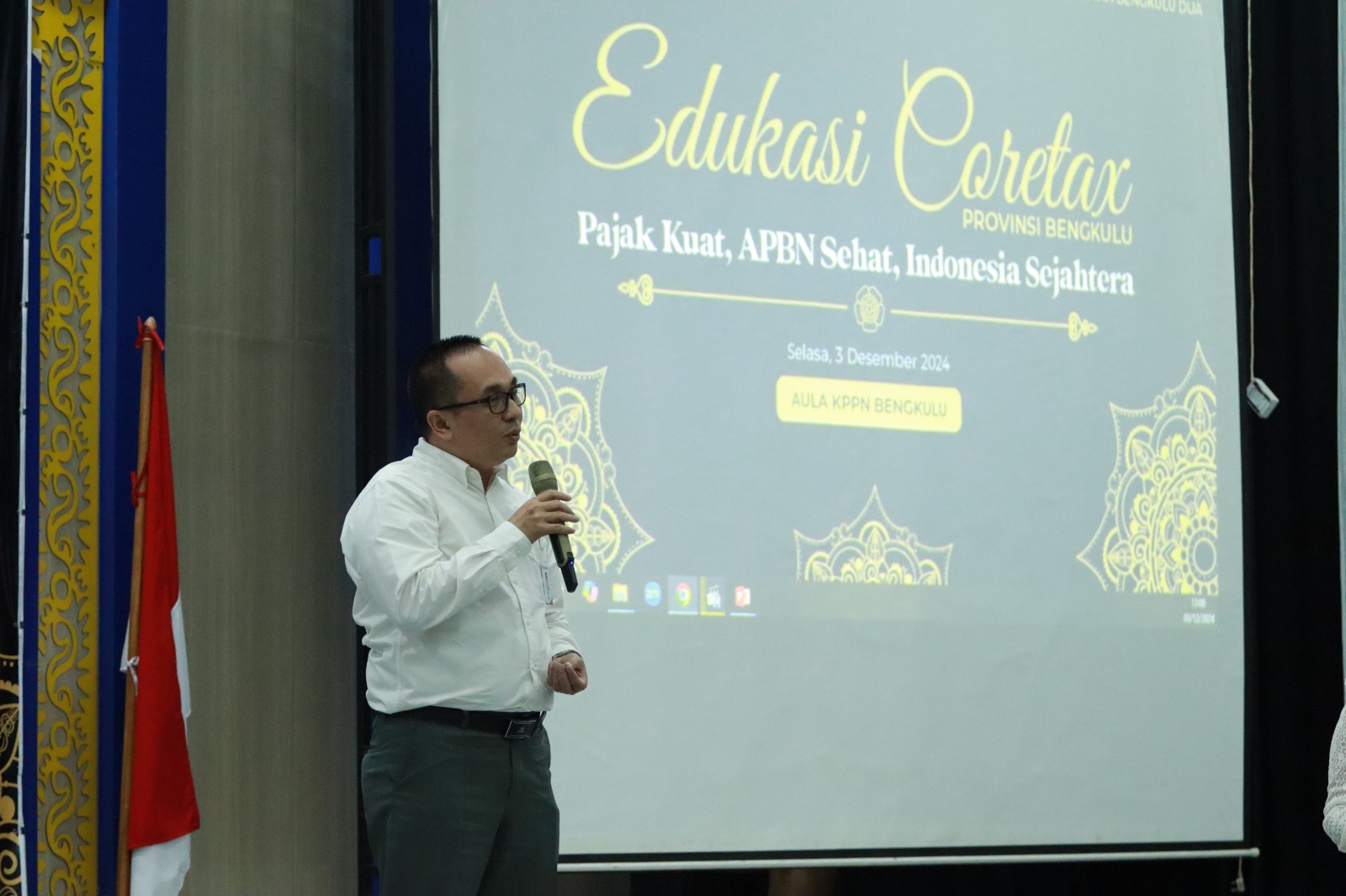 Wajib pajak memberikan testimoni dan menyampaikan rasa terima kasih atas pelayanan yang diberikan oleh Kantor Pelayanan Pajak (KPP) Pratama Bengkulu Satu dan KPP Pratama Bengkulu Dua dalam Edukasi Coretax di Aula Kantor Pelayanan Perbendaharaan Negara (KPPN) Bengkulu, Kecamatan Ratu Samban, Kota Bengkulu (Selasa, 3/12).