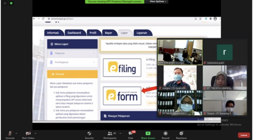 Pemaparan materi hingga simulasi pengisian e-Form disampaikan oleh Tim Penyuluh Pajak KPP Pratama Cileungsi yaitu Erna Rusvalita, Mohammad Muslimin, dan Andang Indrariyono.