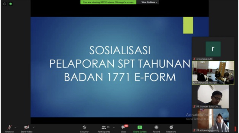 KPP (Kantor Pelayanan Pajak) Pratama Cileungsi kembali mengadakan kelas pajak bertema "Pelaporan SPT Tahunan bagi Wajib Pajak Badan (SPT 1771) melalui e-Form" secara daring yang dipandu dari gedung KPP Pratama Cileungsi (Selasa, 20/4).