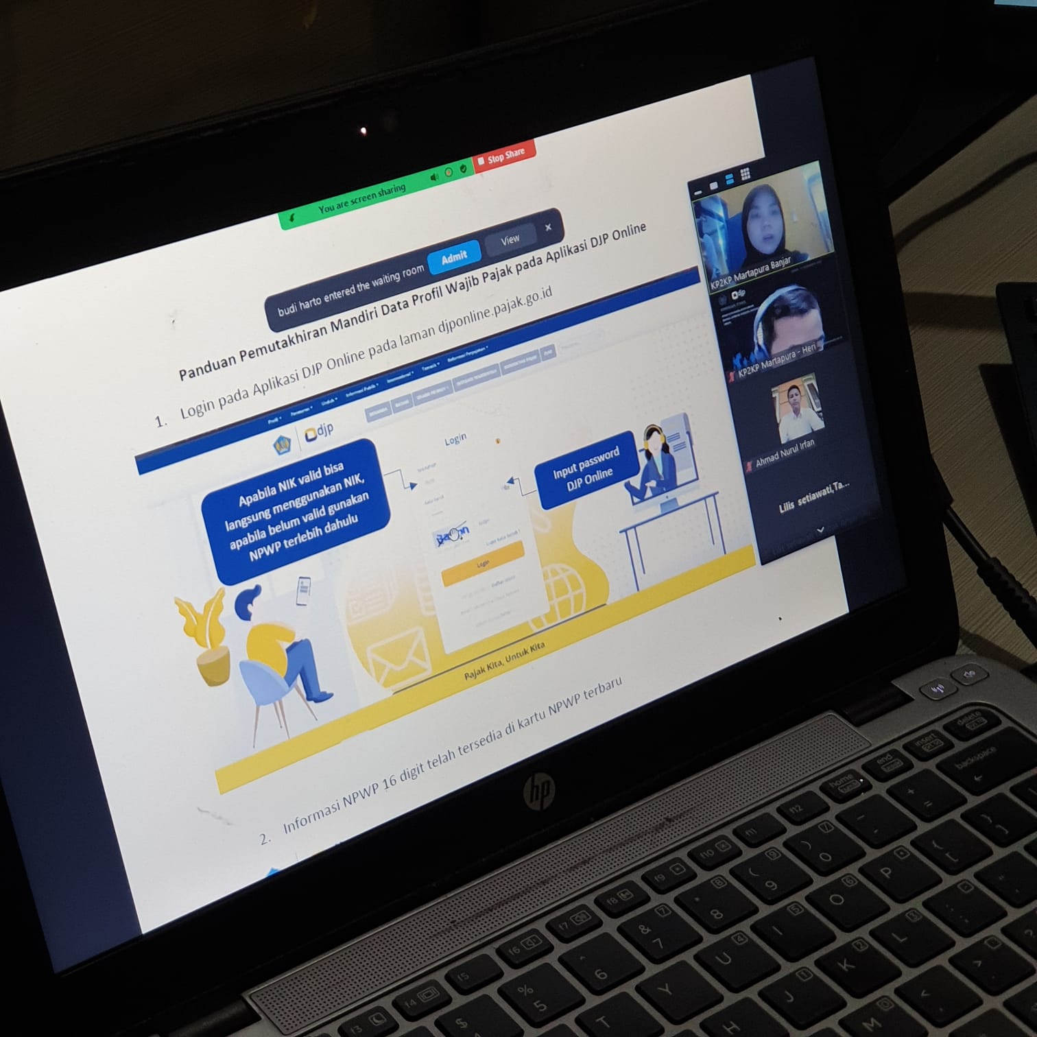 Dilanjutkan penyampaian materi oleh tim penyuluh KP2KP Martapura terkait implementasi penggunaan Nomor Induk Kependudukan (NIK) sebagai Nomor Pokok Wajib Pajak (NPWP) sesuai amanat UU HPP. Dijelaskan pula bahwa pemadanan NIK menjadi NPWP dapat dilakukan secara mandiri melalui laman pajak.go.id. Hal ini wajib dilakukan oleh WP paling lambat tanggal 31 Maret 2023 bersamaan dengan batas waktu pelaporan SPT Tahunan PPh OP.