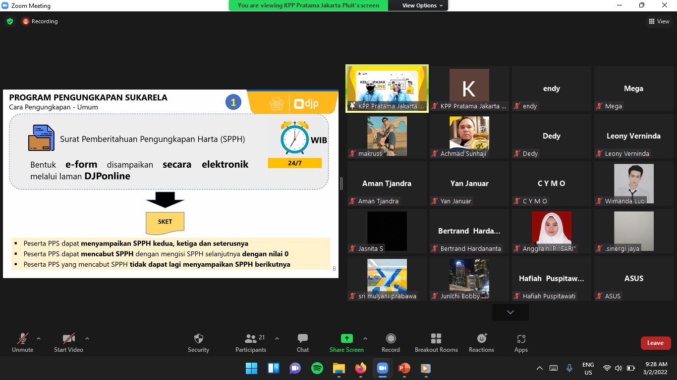 Tim Penyuluh Pajak Kantor Pelayanan Pajak (KPP) Pratama Jakarta Pluit menyelenggarakan kelas pajak Program Pengungkapan Sukarela (PPS) di ruang rapat KPP Pratama Jakarta Pluit (Rabu, 9/3).