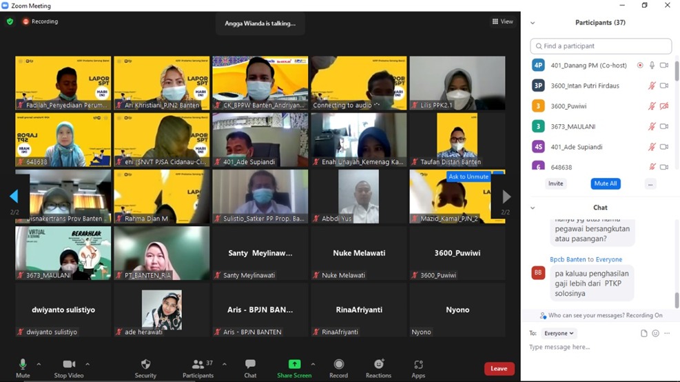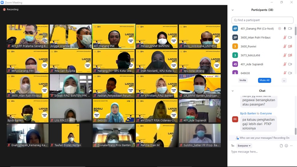 Kantor Pelayanan Pajak (KPP) Pratama Serang Barat melaksanakan kegiatan Kelas Pajak Pelaporan SPT Tahunan untuk pegawai di seluruh lingkungan Instansi Vertikal Kota Serang secara online melalui aplikasi Zoom Cloud Meeting dari KPP Pratama Serang Barat, Kota Serang (Kamis, 17/02).
