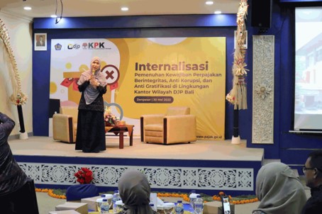 Sebagai salah satu bentuk mewujudkan komitmen pencegahan korupsi di kalangan pegawai Direktorat Jenderal Pajak (DJP), Kantor Pelayanan Pajak (KPP) Madya Denpasar mengundang sejumlah wajib pajak (WP) untuk turut hadir dan menyaksikan kegiatan Pemenuhan Kewajiban Perpajakan Berintegritas, Antikorupsi, dan Antigratifikasi. Kegiatan tersebut dilaksanakan di Aula Kantor Wilayah Direktorat Jenderal Pajak (Kanwil DJP) Bali (Selasa, 30/5).