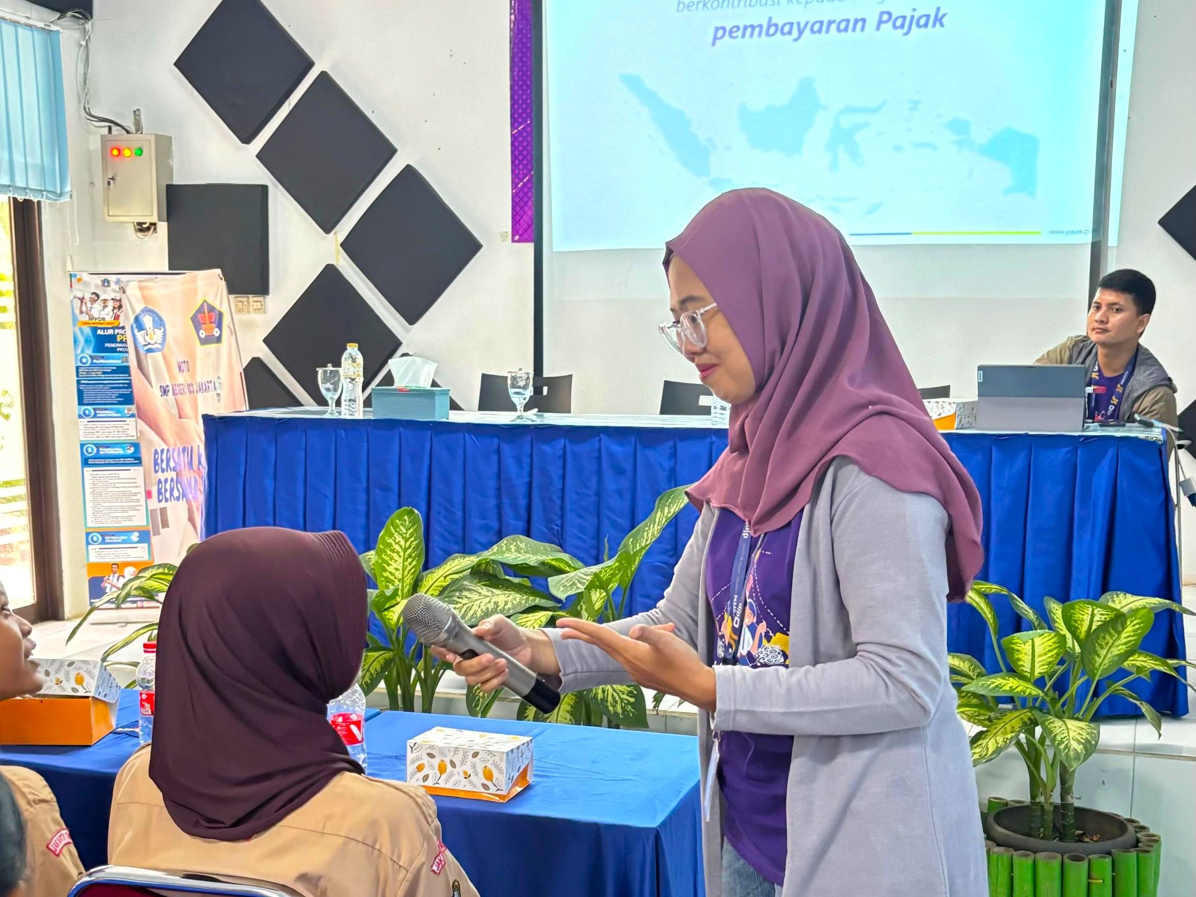 Selanjutnya, Tim KPP Pratama Jakarta Pasar Rebo memandu seluruh rangkaian Pajak Bertutur diawali dengan menyorakkan tagline “Sehari Mengenal Selamanya Bangga” untuk membangkitkan semangat dan antusiasme para siswa. Pada kesempatan ini, Tim KPP Pratama Jakarta Pasar Rebo mengenalkan akan pentingnya pajak dimana pajak berkontribusi sebesar 71% terhadap penerimaan negara.