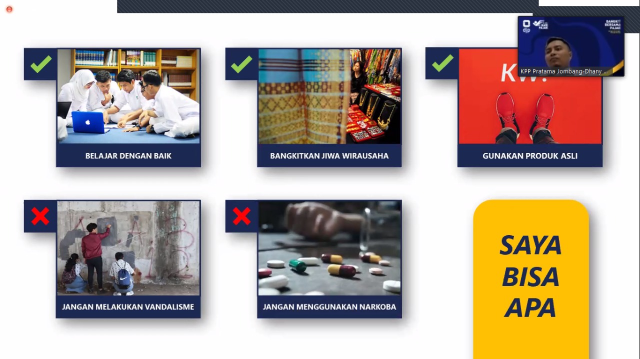 KPP Pratama Jombang menyelenggarakan Pajak Bertutur (Patur) dalam rangka memperingati Hari Pajak Tahun 2020 melalui media Zoom Meeting di Jombang (Rabu, 15/7). Sebanyak 28 siswa dari SMA Negeri 2 (SMADA) Jombang mengikuti kegiatan yang mengusung tema "Penguatan Karakter Generasi Emas Cerdas dan Sadar Pajak" di tempat masing-masing.