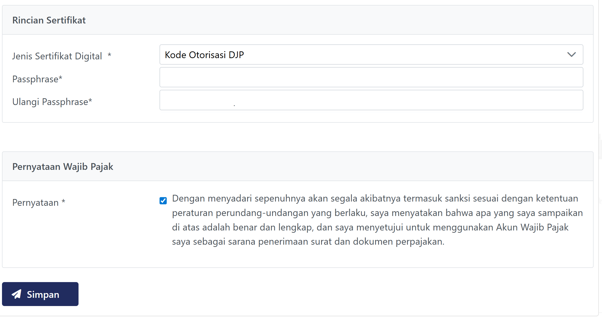 - Pada layar berikutnya, gulir (scroll) ke bagian bawah dan pada isian jenis sertifikat digital pilih kode otorisasi DJP.