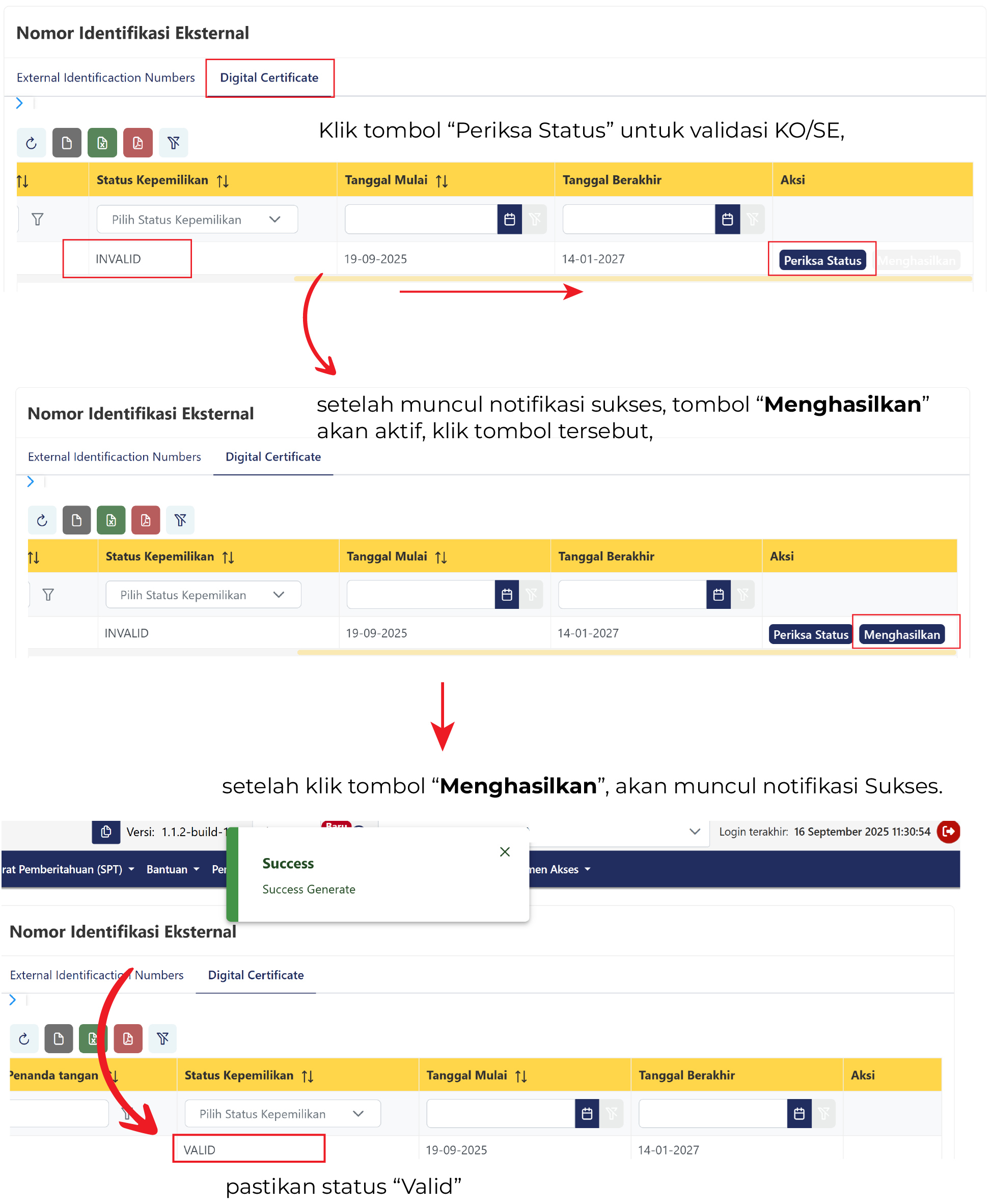 - Apabila muncul notifikasi sukses, klik tombol Menghasilkan. Apabila muncul notifikasi belum berhasil, ulangi proses permintaan kode otorisasi di atas.