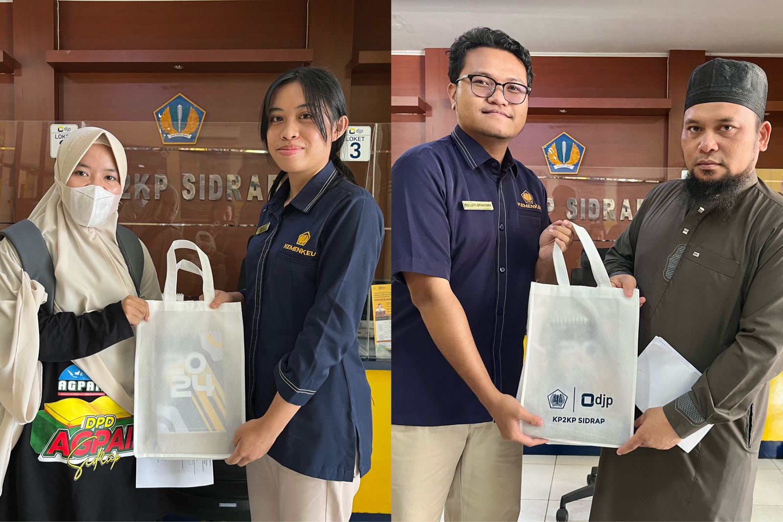 Kantor Pelayanan, Penyuluhan, dan Konsultasi Perpajakan (KP2KP) Sidrap memberikan apresiasi kepada 2 (dua) wajib pajak pelapor pertama Surat Pemberitahuan (SPT) Tahunan 2023 di Kabupaten Sidenreng Rappang yang beralamat di Jalan Ganggawa, Kelurahan Majjelling, Kecamatan Maritengngae, Kabupaten Sindenreng Rappang (Rabu, 3/1).