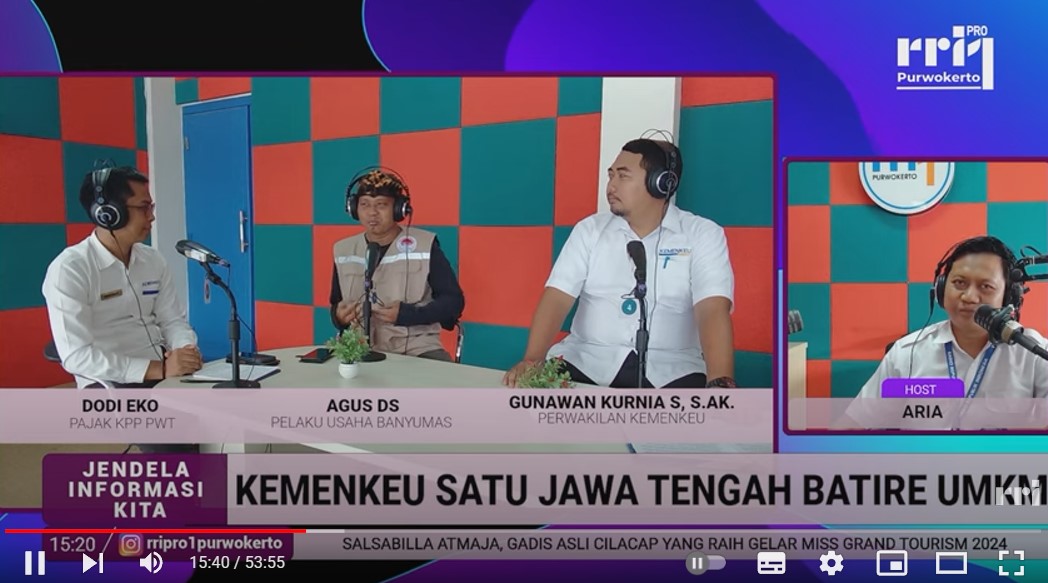 Kantor Pelayanan Pajak (KPP) Pratama Purwokerto bersama dengan Tim Pokja Teknis Usaha Mikro Kecil Menengah (UMKM) Perwakilan Kementerian Keuangan (Kemenkeu) Jawa Tengah dan Pelaku Usaha Banyumas Raya (PUBR) melakukan bincang radio edisi UMKM di Radio Pro 1 RRI Purwokerto, Kecamatan Purwokerto Timur, Banyumas (Senin, 29/1).