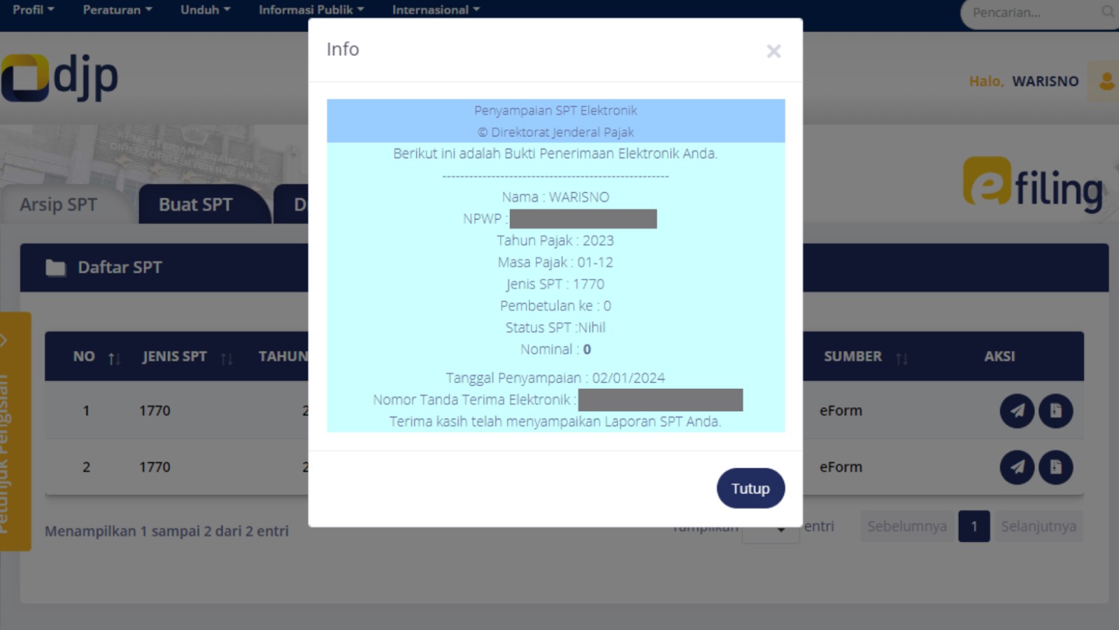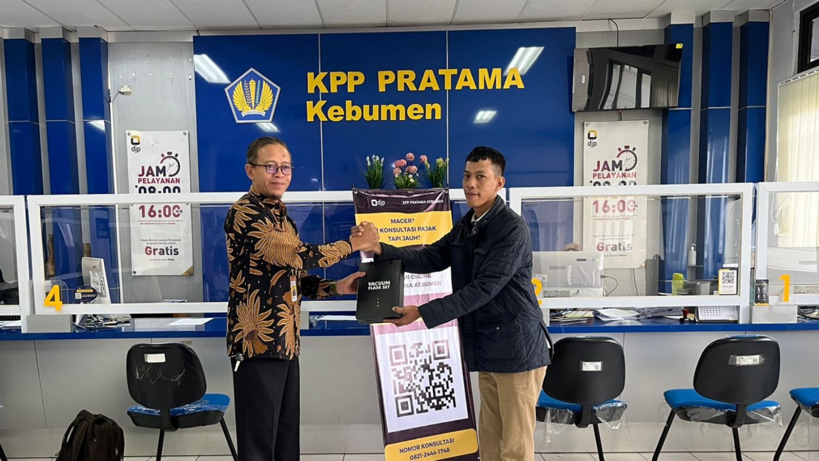 Warisno, wajib pajak terdaftar Kantor pelayanan Pajak (KPP) Pratama Kebumen, melakukan pelaporan Surat Pemberitahuan (SPT) Tahunan Orang Pribadi tahun 2023 di Tempat Pelayanan Terpadu (TPT) KPP Pratama Kebumen (Selasa, 2/1). Ia merupakan wajib pajak pertama yang tercatat dalam antrean loket helpdesk KPP Pratama Kebumen, sekaligus wajib pajak orang pribadi pertama yang melaporkan SPT Tahunan tahun 2023.