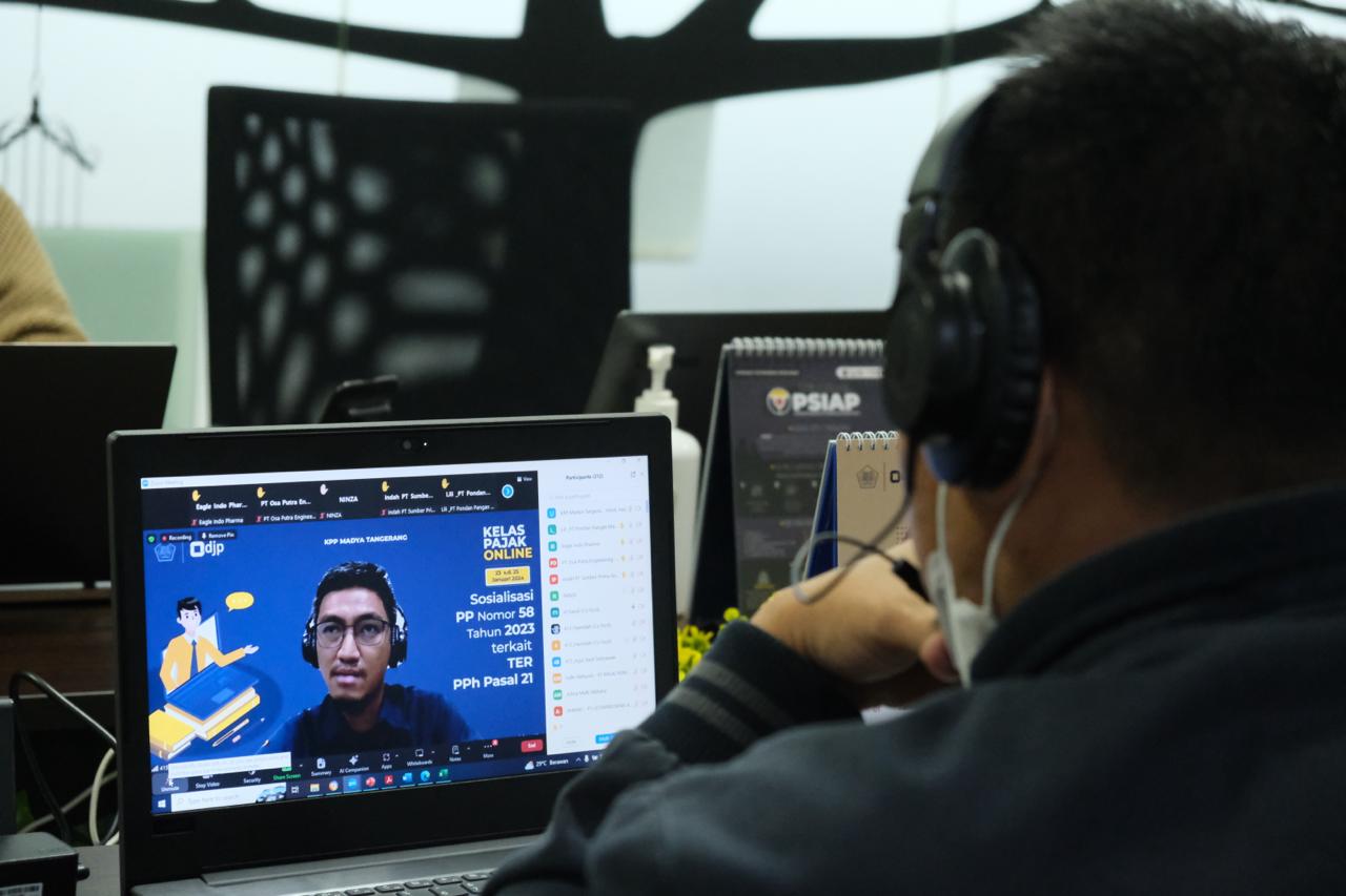Kantor Pelayanan Pajak (KPP) Madya Tangerang menyelenggarakan kelas pajak secara daring dengan tema Peraturan Pemerintah (PP) Nomor 58 Tahun 2023 tentang Tarif Pemotongan Pajak Penghasilan Pasal 21 atas Penghasilan Sehubungan dengan Pekerjaan, Jasa, atau Kegiatan Wajib Pajak Orang Pribadi pada 23 s.d. 25 Januari 2024 di Ruang Rapat Cisadane KPP Madya Tangerang di Gedung Menara Top Food, Alam Sutera, Jalan Jalur Sutera Barat No.3, RT.003/RW.006, Panunggangan Timur, Pinang, Kota Tangerang, Banten (Kamis, 25/1).