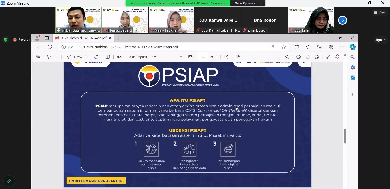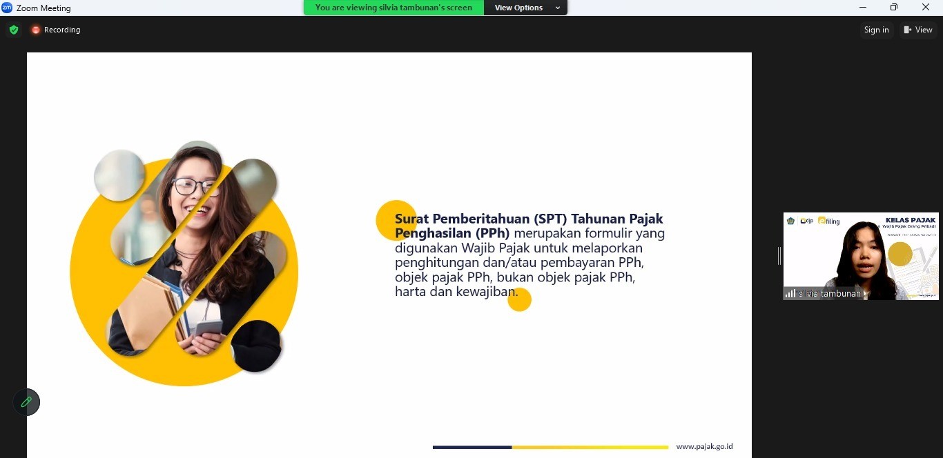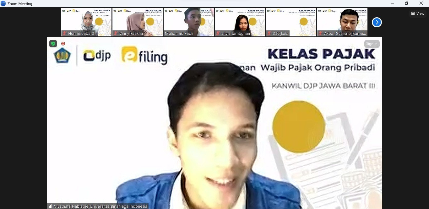 Kantor Wilayah Direktorat Jenderal Pajak (Kanwil DJP) Jawa Barat III menyelenggarakan Kelas Pajak secara daring melalui zoom meeting yang berpusat di Gedung Kanwil DJP Jawa Barat III, Kota Bogor (Selasa, 20/2). Kegiatan dimulai pukul 09.00 WIB dan berlangsung selama dua jam.