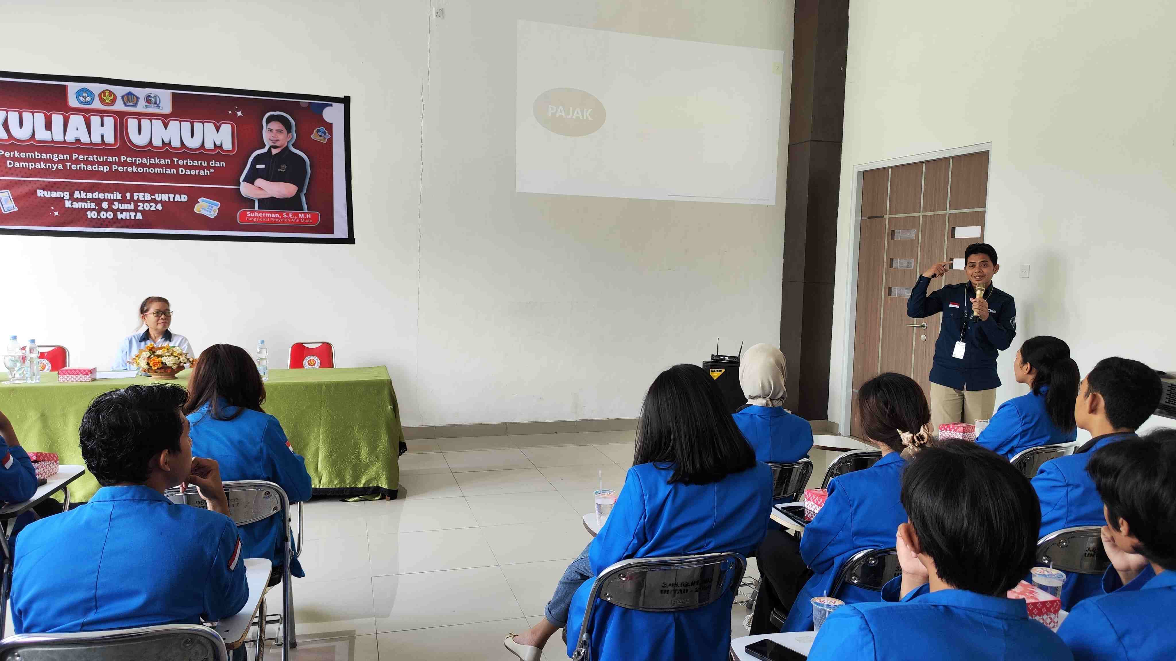 Kantor Pelayanan Pajak (KPP) Pratama Palu berkolaborasi dengan Tax Center Universitas Tadulako (UNTAD) menggelar kuliah umum perpajakan di Ruang Akademik Kampus Fakultas Ekonomi dan Bisnis UNTAD, Kota Palu, Sulawesi Tengah (Kamis, 6/6). Kegiatan yang dihadiri oleh 5 dosen dan 25 mahasiswa Jurusan Akuntansi ini bertujuan untuk meningkatkan pemahaman dan kesadaran pajak di kalangan mahasiswa. Kuliah umum ini mengangkat tema “Perkembangan Peraturan Perpajakan Terbaru dan Dampaknya Terhadap Perekonomian Daerah”.