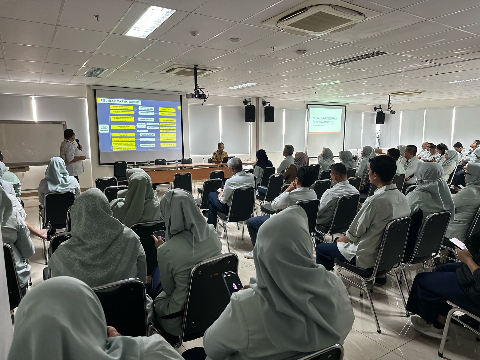 Kantor Pelayanan Pajak (KPP) Pratama Jakarta Duren Sawit mengadakan acara Edukasi dan Penyuluhan mengenai PMK-168 Tahun 2023 bekerja sama dengan Rumah Sakit Khusus Daerah (RSKD) yang berfokus pada Petunjuk Pelaksanaan Pemotongan Pajak Atas Penghasilan Sehubungan dengan Pekerjaan, Jasa, Atau Kegiatan Orang Pribadi. Sosialisasi ini diikuti oleh 50 peserta secara offline dan 15 peserta melalui platform Zoom, dilaksanakan di Aula lantai 8 RSKD Duren Sawit (Rabu, 26/6).