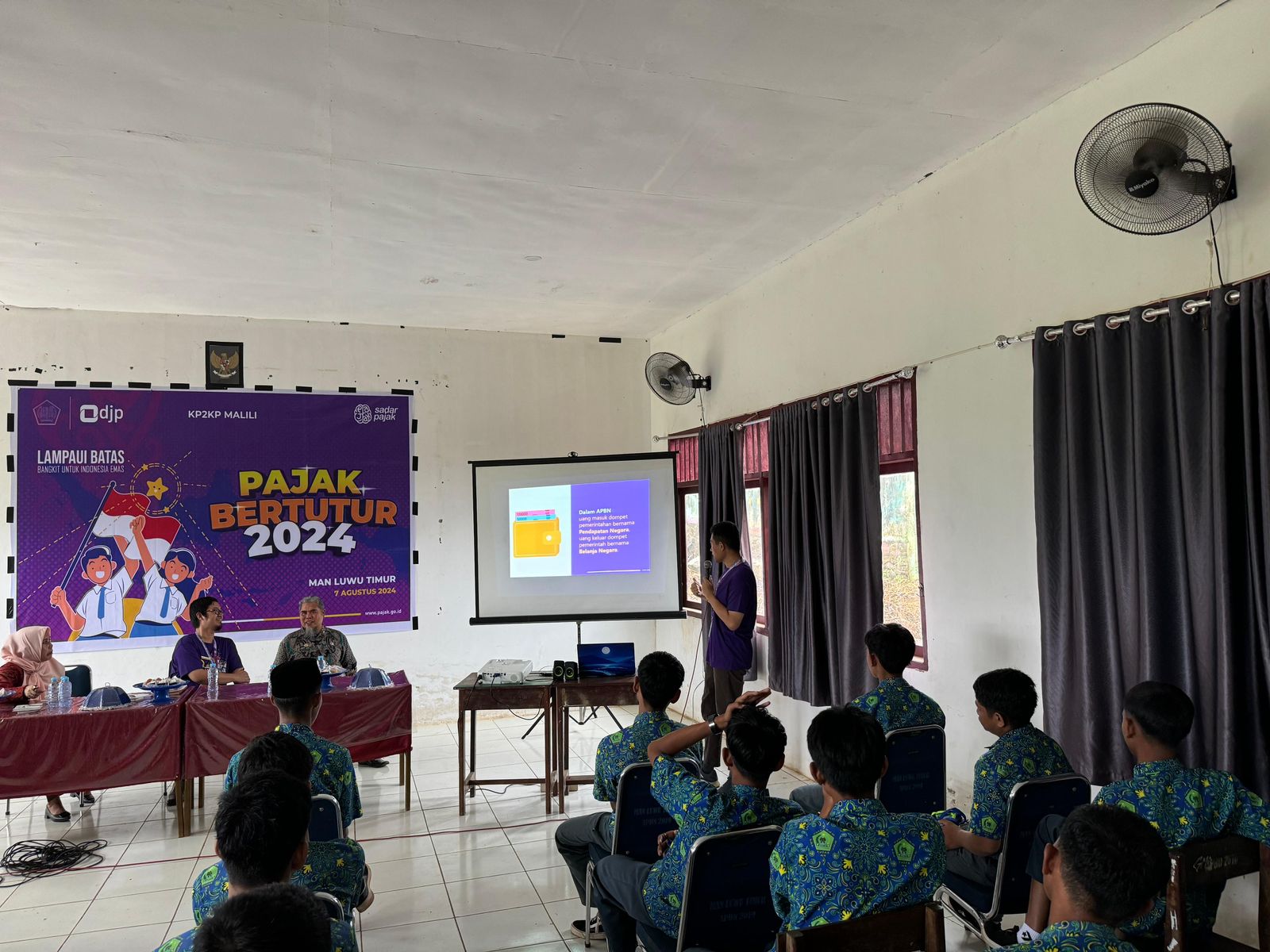Kantor Pelayanan, Penyuluhan dan Konsultasi Perpajakan (KP2KP) Malili kembali menyelenggarakan kegiatan Pajak Bertutur 2024 dengan tema ‘Lampaui Batas, Bangkit untuk Indonesia Emas’ yang kali ini berlokasi di MAN Luwu Timur (Rabu, 7/8). Sejumlah 30 siswa yang keseluruhan merupakan siswa kelas 12 memadati ruang Aula MAN Luwu Timur untuk mengikuti kegiatan ini.
